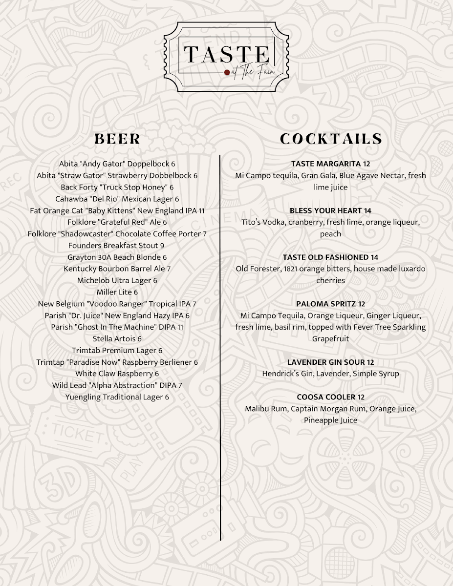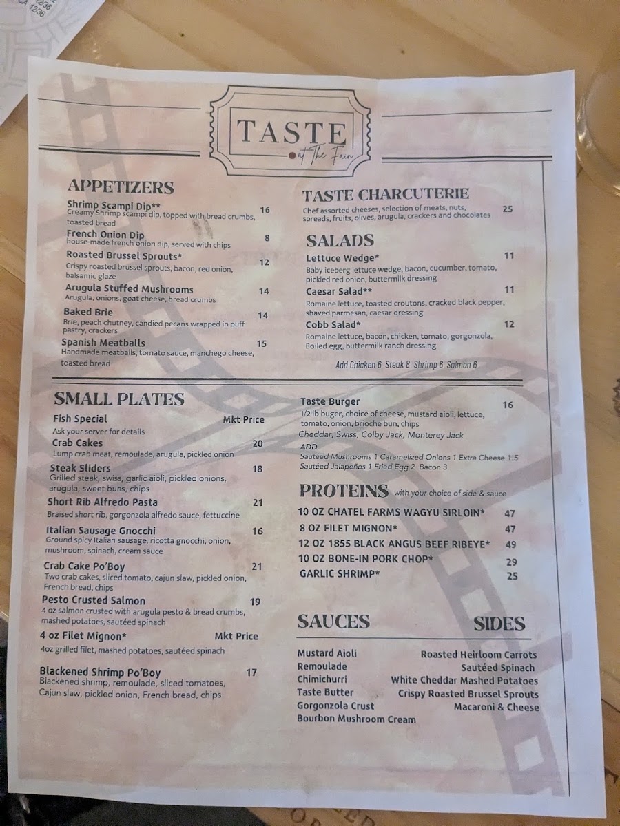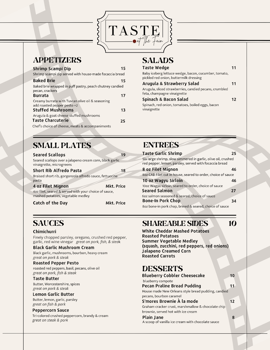 From a reviewer's perspective, the menu at Taste At The Fain impresses with its thoughtful balance of small bites and hearty entrees. The tapas selection, including Shrimp Scampi Dip, Grilled Steak Sliders, Baked Brie, Arugula and Goat Cheese Stuffed Mushrooms, and the Charcuterie Board, offers a refined start, perfect for sharing. For lighter fare, salads such as the Lettuce Wedge, Strawberry and Arugula Salad, and Spinach Bacon Salad provide fresh, crisp options. The small plates-Short Rib Pasta Alfredo, Seared Scallops, and Grilled Filet Fresh Catch-highlight a blend of indulgent flavors and delicate presentation. Entrees like the House-Cut Prime Cut 12oz Ribeye, Wagyu Beef Sirloin, Seared Salmon 8oz Filet Mignon, and Bone-In Pork Chop showcase premium proteins, complemented by sauces including Chimichurri, Mushroom Cream, Red Pepper Pesto Taste Butter, and Lemon Garlic Butter that elevate each dish. To finish, desserts such as Blueberry Cobbler Cheesecake, Pecan Praline Bread Pudding, and S’mores Brownie A La Mode provide decadent sweetness that caps the meal beautifully. Overall, the menu demonstrates a careful attention to both variety and quality, making every visit a memorable culinary experience.